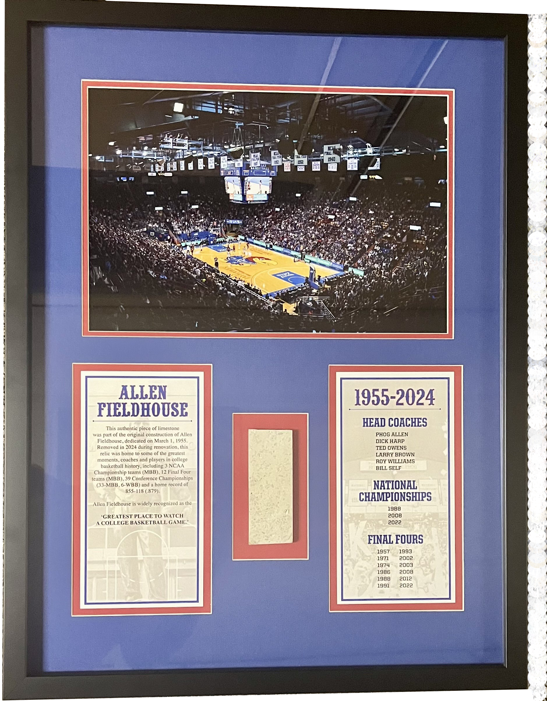 Own a piece of history with a framed photo of Allen Fieldhouse that includes an authentic piece of limestone from the original 1955 construction of the fieldhouse. The informational history of Allen Fieldhouse from 1955-2024 is also captured featuring the Head Coaches that coached during this period, 12 Final Fours, and 3 National Championships. This item is perfect for any office, den, or mancave.