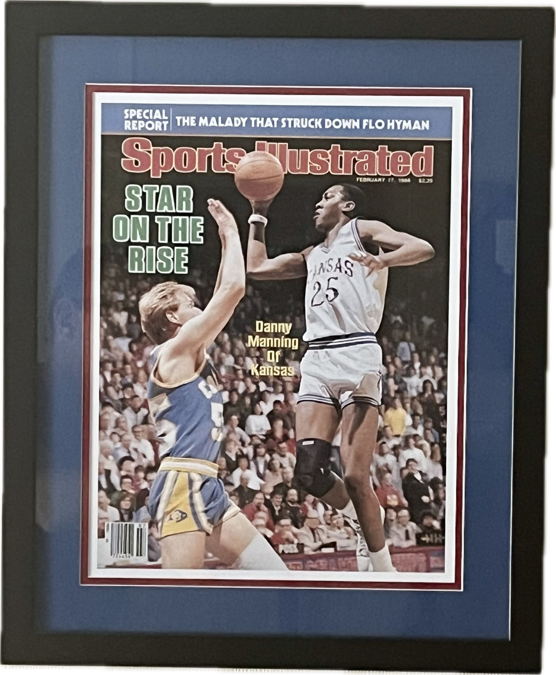 Danny Manning was one of the greatest players in the history of KU Basketball. Sports Illustrated featured Manning on the February 17, 1986 cover with the headline, STAR ON THE RISE. In the featured game, KU defeated Colorado 59-56. The framed cover is double matted with a dimension of 16.5″ W X 20″ H.